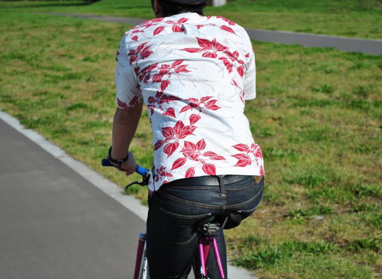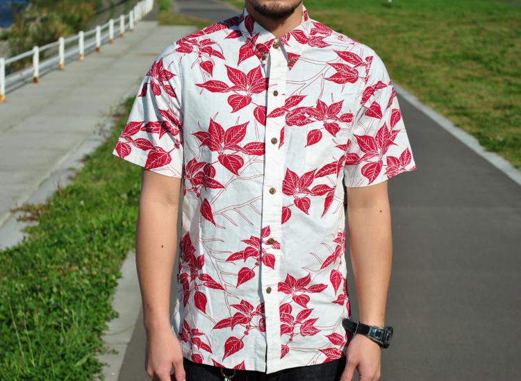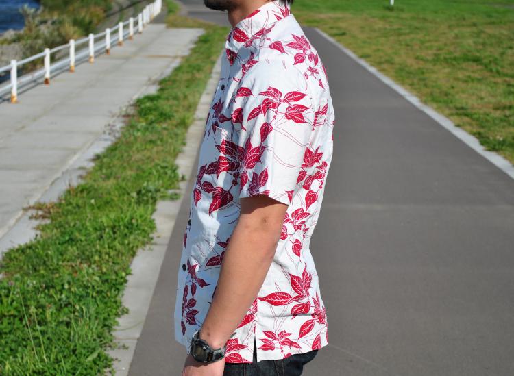 白地のシャツに、よく映える赤色リーフのプリントがとてもcoolな印象です。しっかりとした生地だが、通気性がよく通年着ることができます。