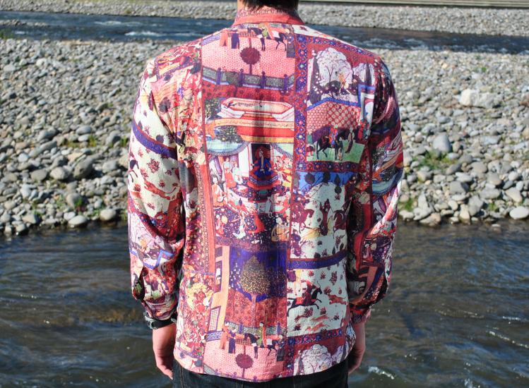 オリエンタルなプリントが特徴的で、色合いはどこかエスニックな雰囲気でもあります。とてもインパクトがあるシャツですが、アウターからチラリと見せる着こなしもCool。もちろん夏はアウターシャツとしても万能な一枚。