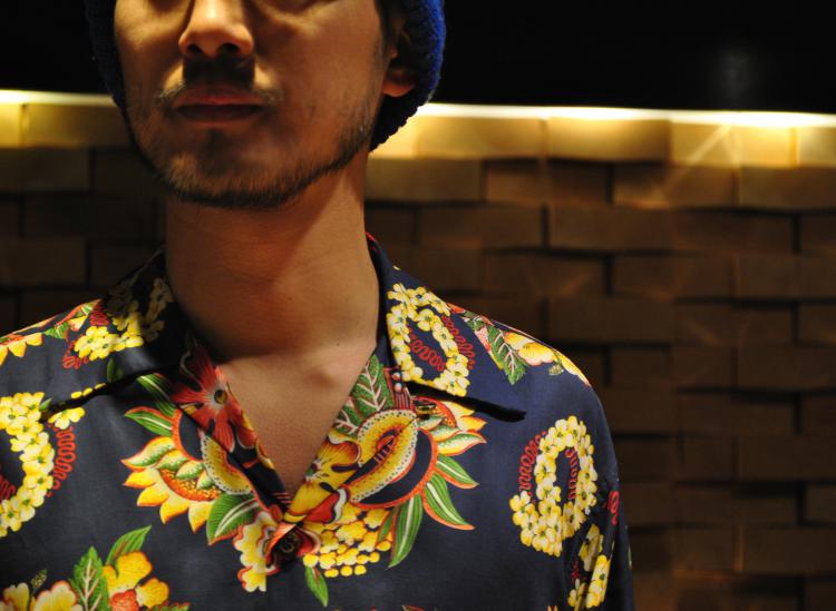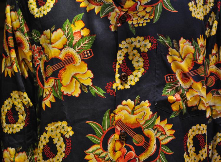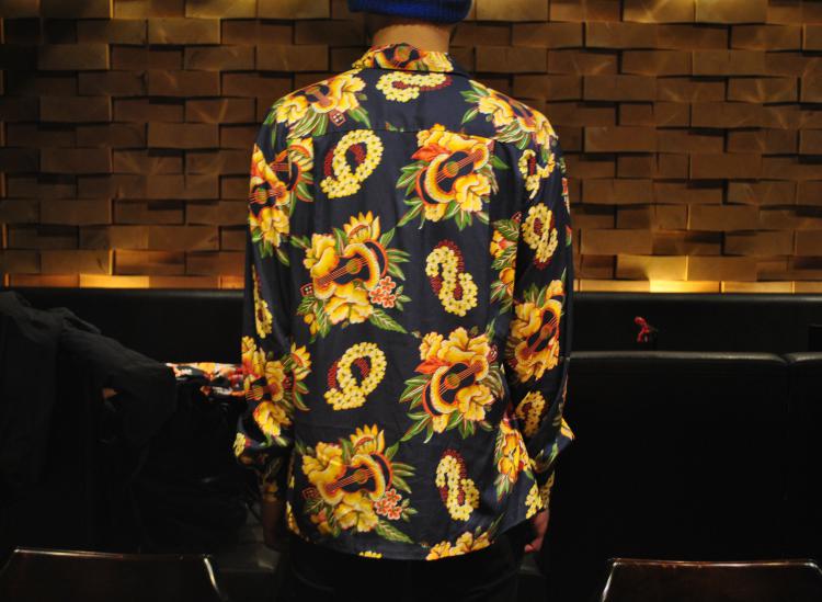 ネイビーを基調とし、イエローが鮮やかなハイビスカスやレイの花が施された一枚。ウクレレがハイビスカスに絡みついてる大胆なイラストも魅力的。ボタンを開けてゆるく着てみるのもカッコいい一枚。